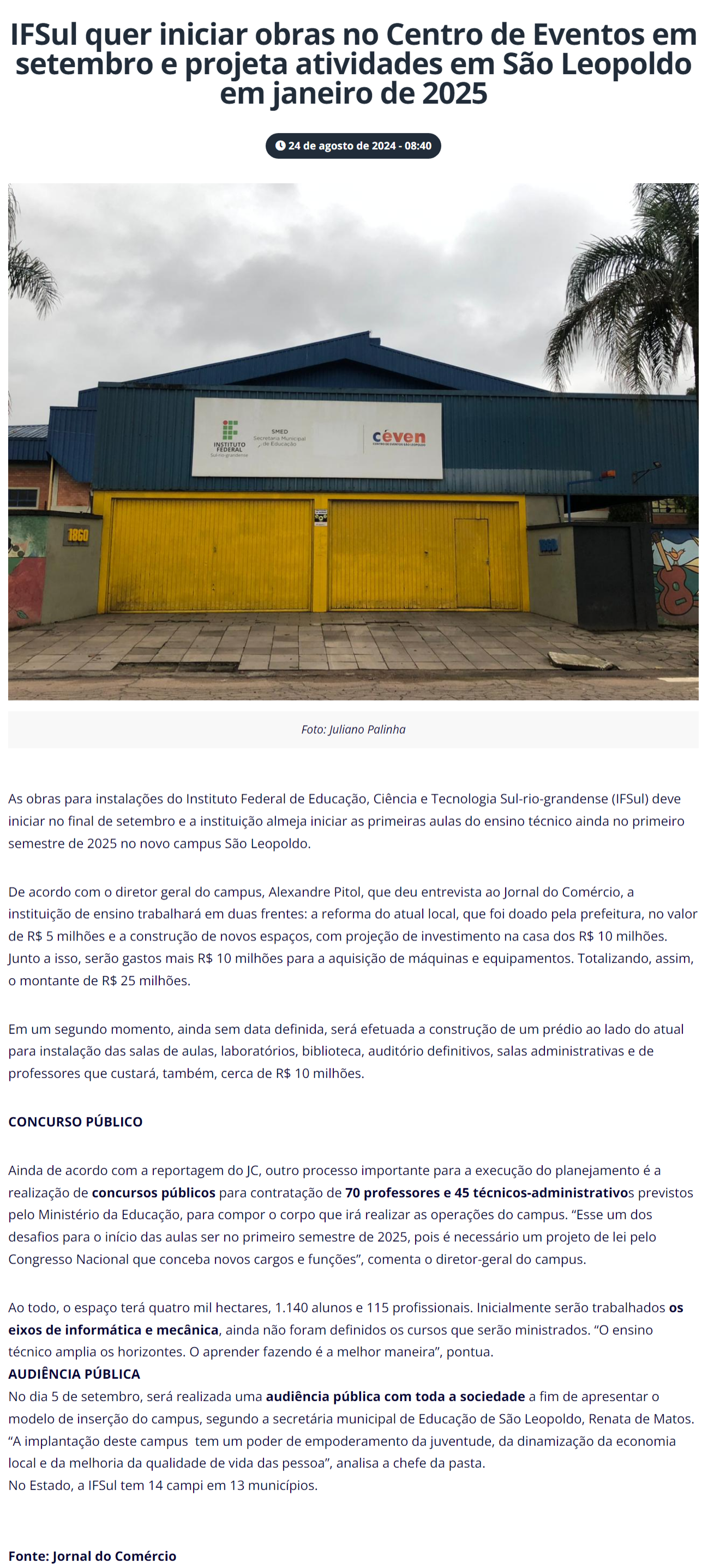 Berlinda News - IFSul quer iniciar obras no Centro de Eventos em setembro e projeta atividades em São Leopoldo em janeiro de 2025