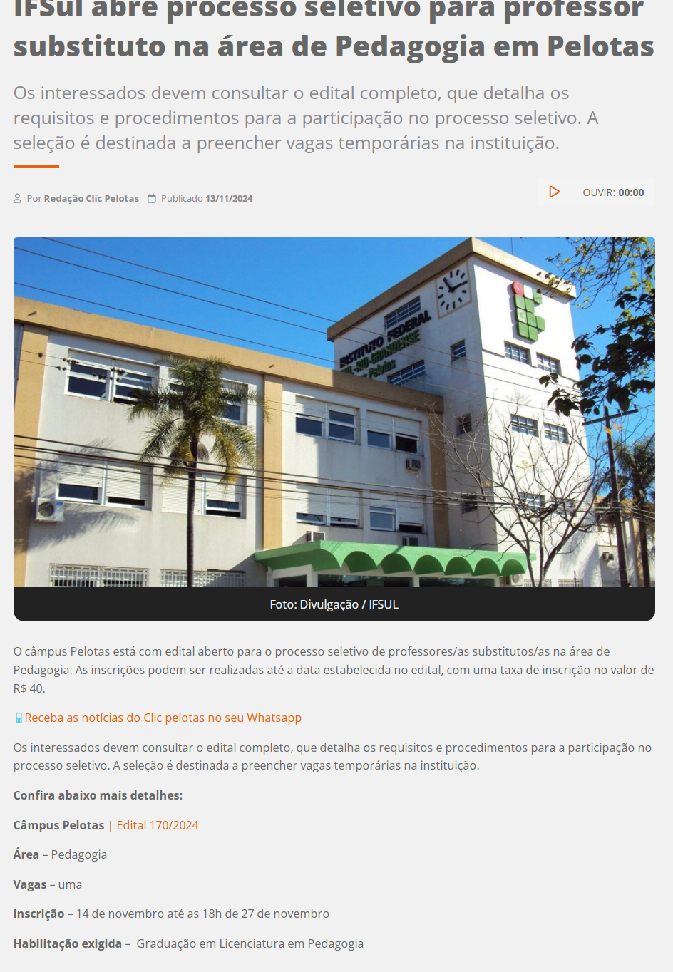Clic Pelotas - IFSul abre processo seletivo para professor substituto na área de Pedagogia em Pelotas