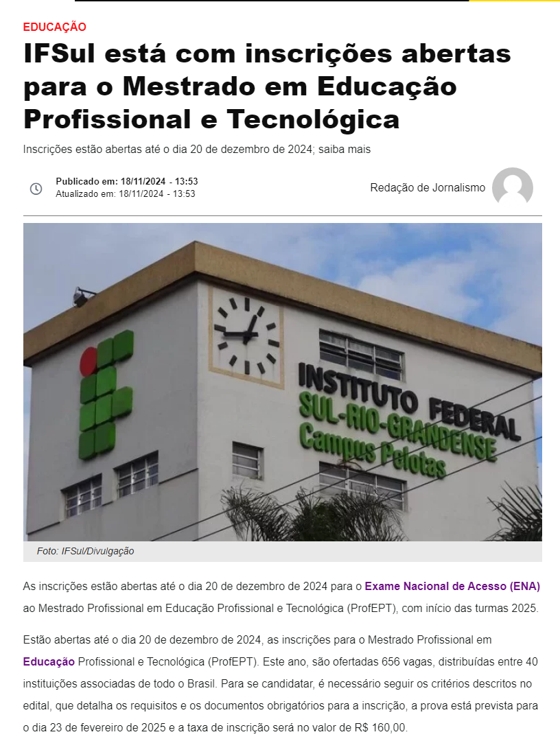 Acústica FM - IFSul está com inscrições abertas para o Mestrado em Educação Profissional e Tecnológica