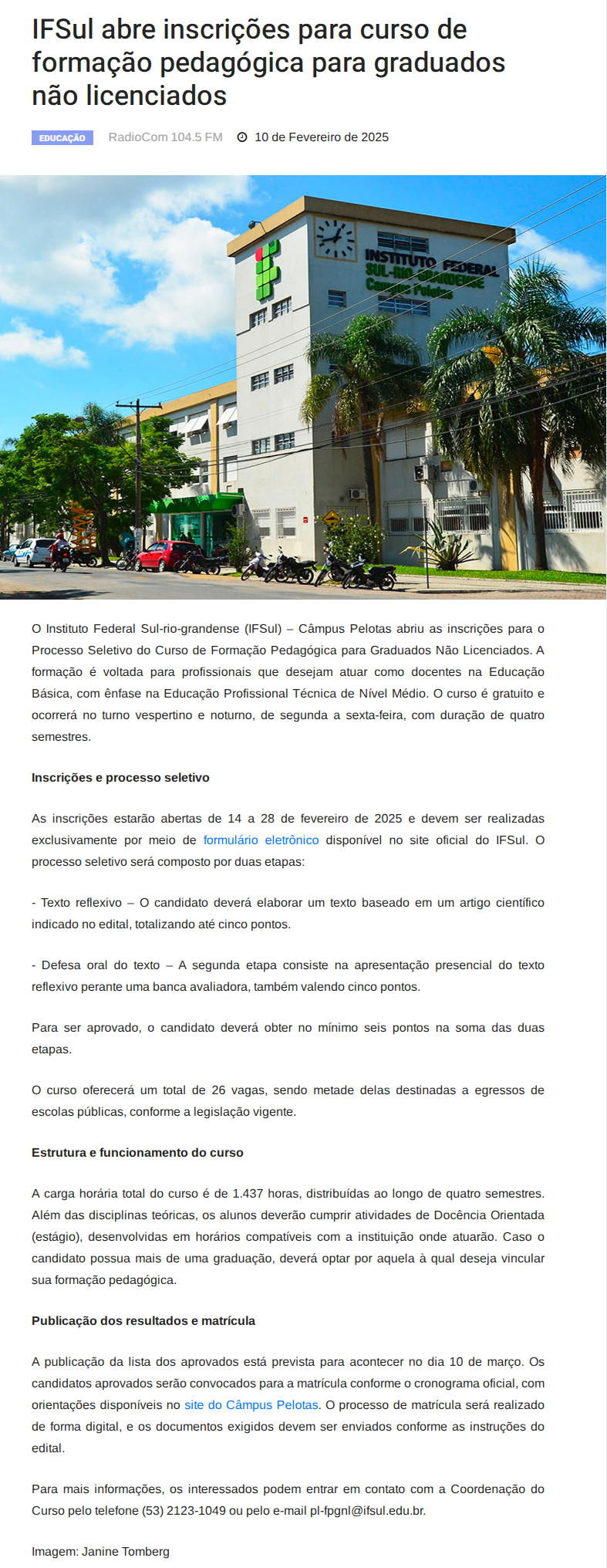 RádioCom - IFSul abre inscrições para curso de formação pedagógica para graduados não licenciados