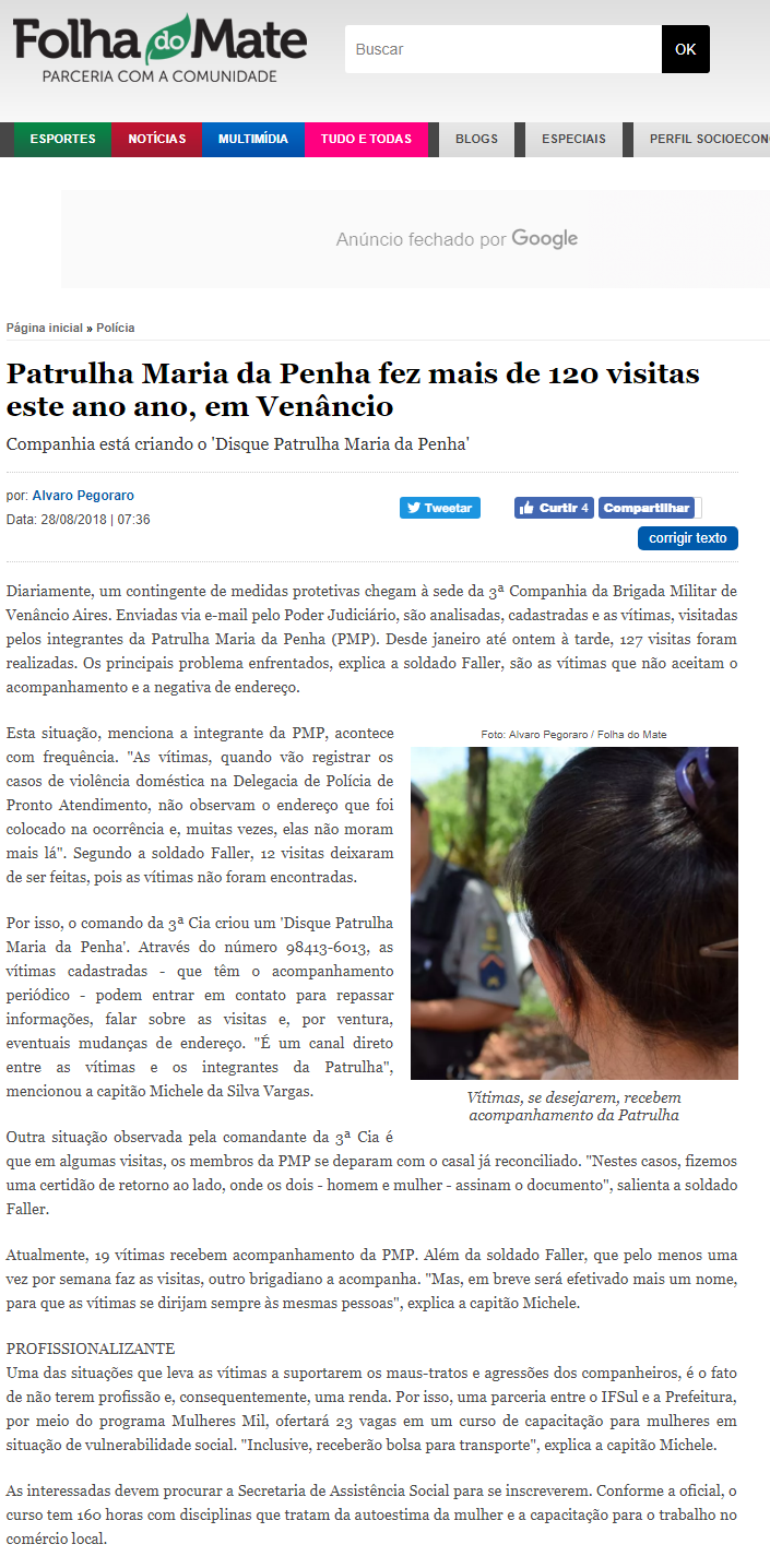 Folha do Mate - Patrulha Maria da Penha fez mais de 120 visitas este ano, em Venâncio