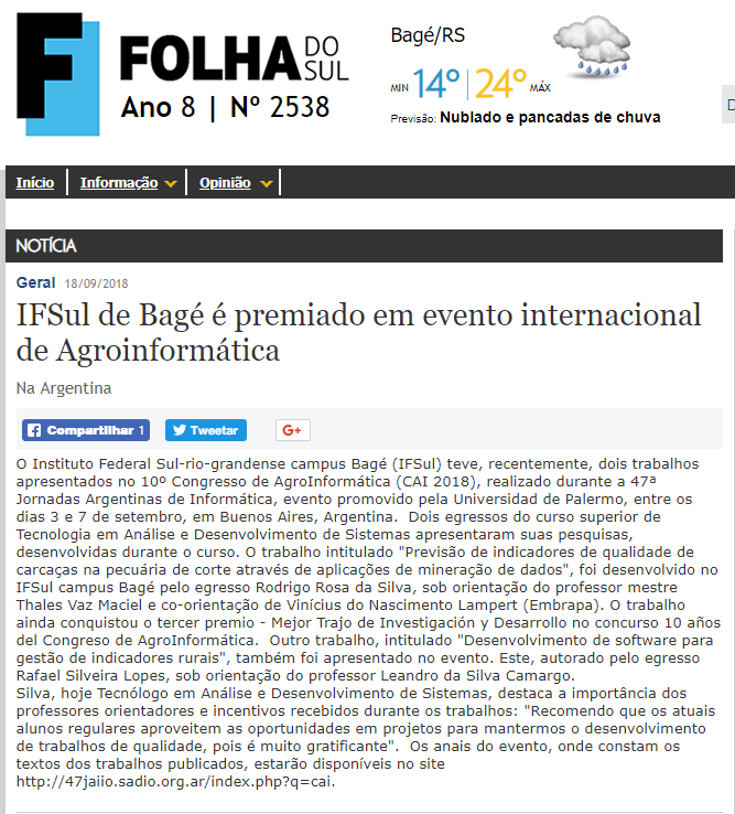 Folha do Sul - IFSul de Bagé é premiado em evento internacional de Agroinformática