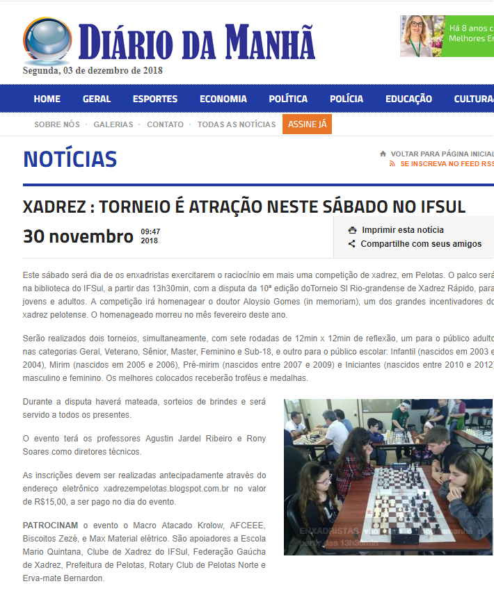 Diário da Manhã - Xadrez: Torneio é atração neste sábado no IFSul