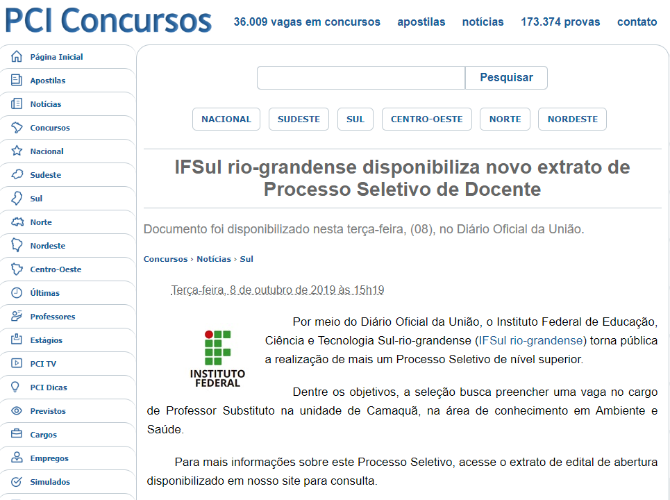 PCI Concursos - IFSul rio-grandense disponibiliza novo extrato de processo seletivo de docente