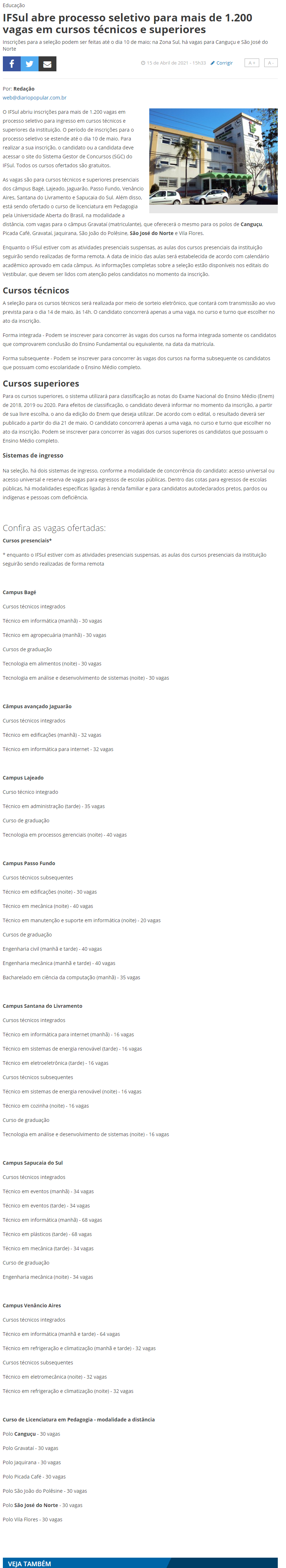 Diário Popular - IFSul abre processo seletivo para mais de 1.200 vagas em cursos técnicos e superiores