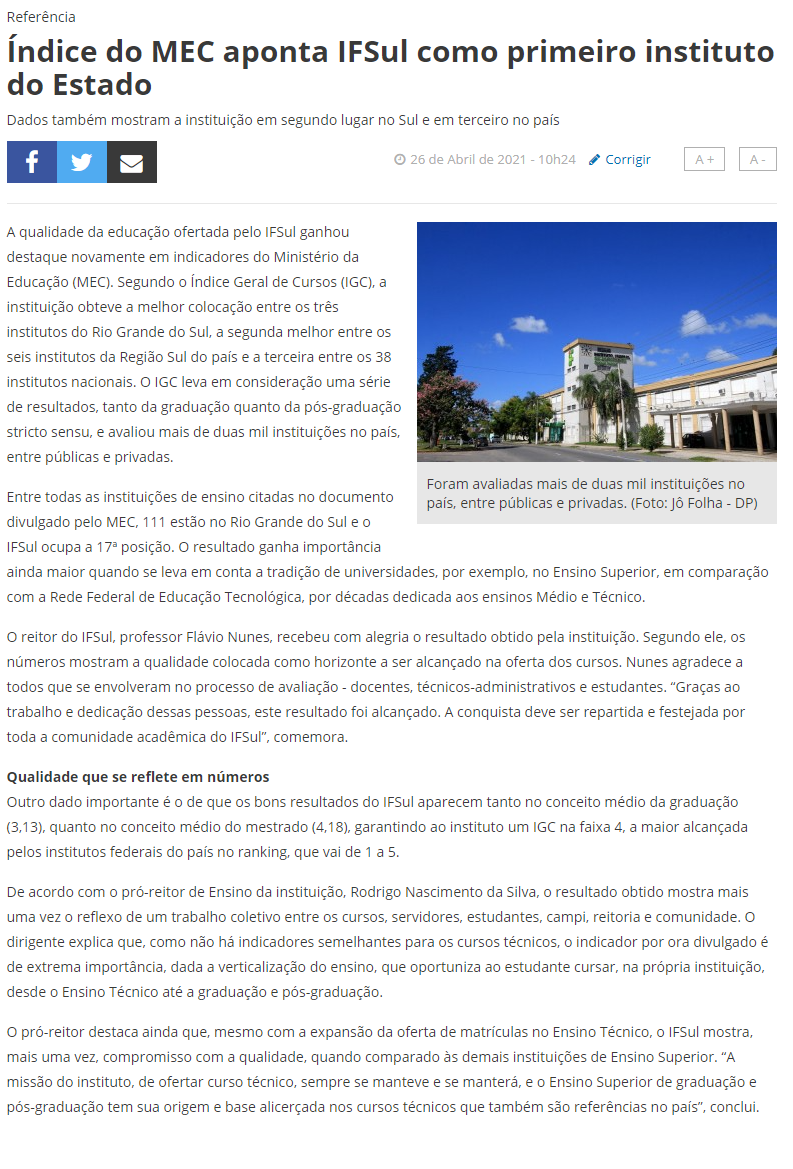 Diário Popular - Índice do MEC aponta IFSul como primeiro instituto do estado