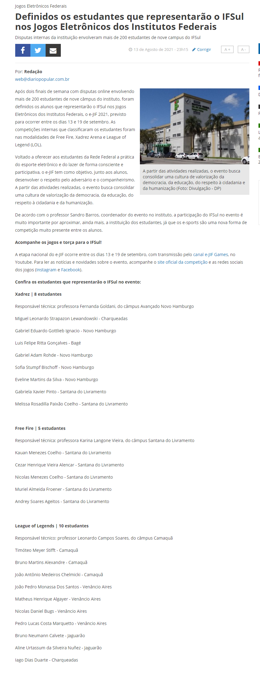 Diário Popular - Definidos os estudantes que representarão o IFSul nos Jogos Eletrônicos dos institutos federais