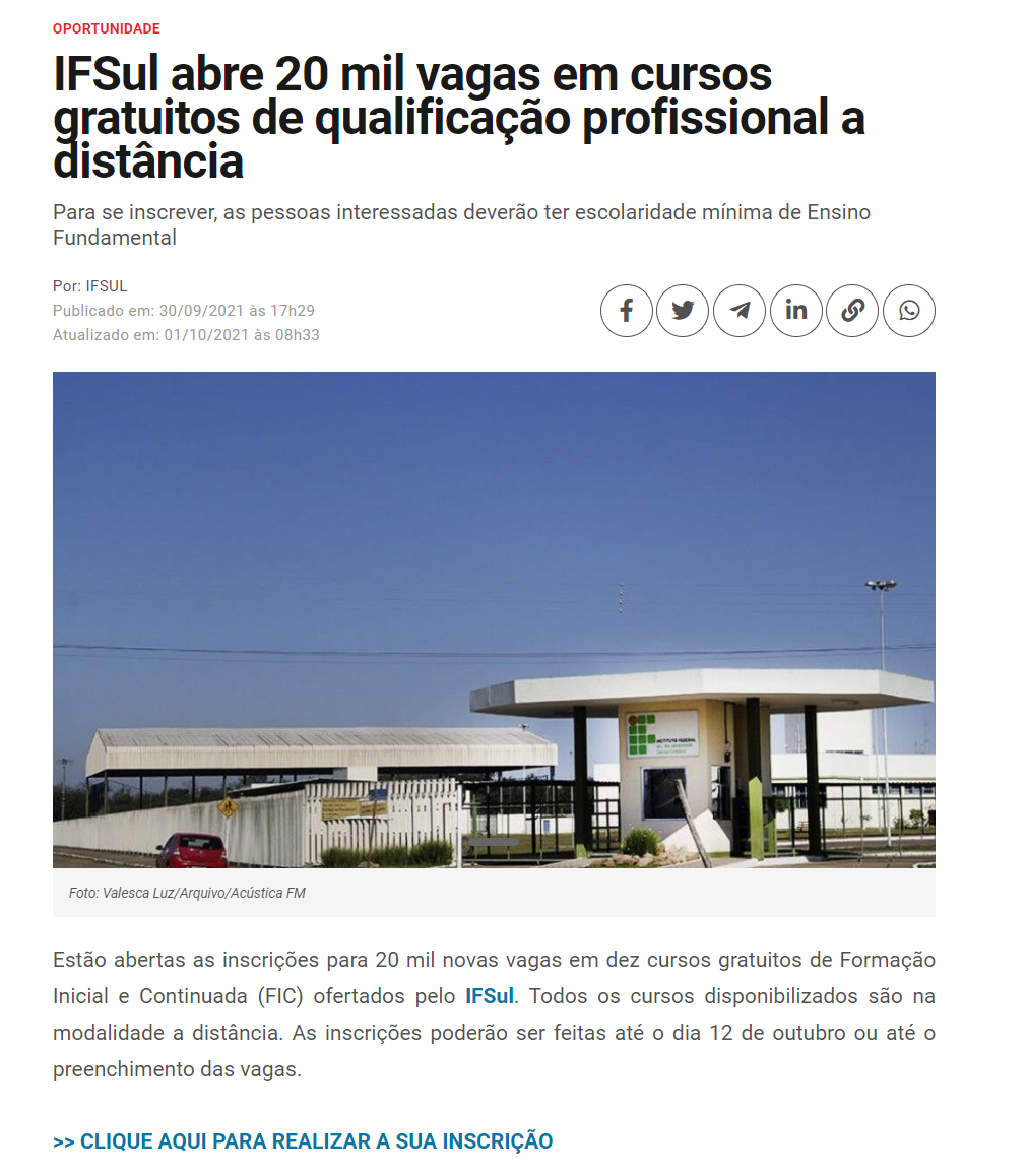Acústica FM - IFSul abre 20 mil vagas em cursos gratuitos de qualificação profissional a distância