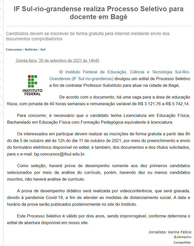 PCI Concursos - IF Sul-rio-grandense realiza Processo Seletivo para docente em Bagé