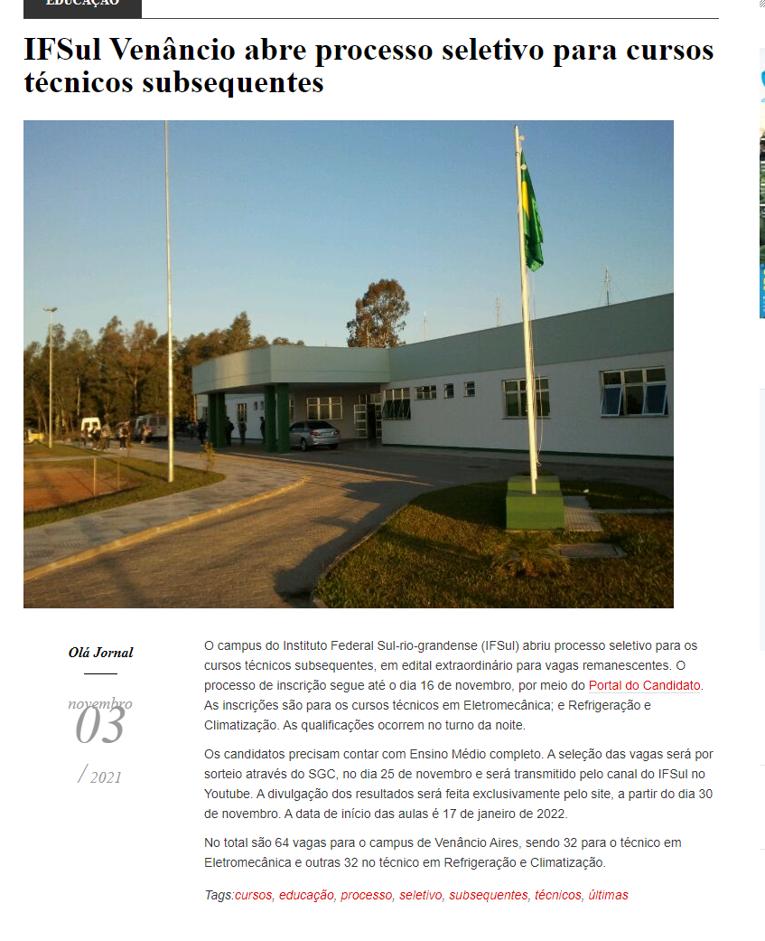 Olá Jornal - IFSul Venâncio abre processo seletivo para cursos técnicos subsequentes