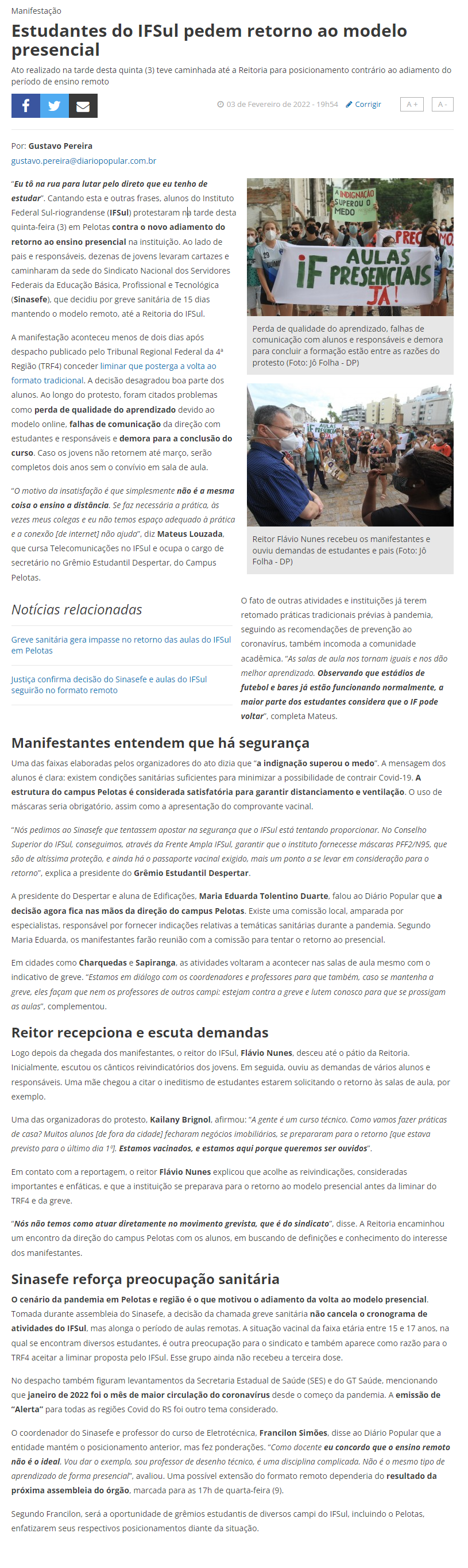 Diário Popular - Estudantes do IFSul pedem retorno ao modelo presencial