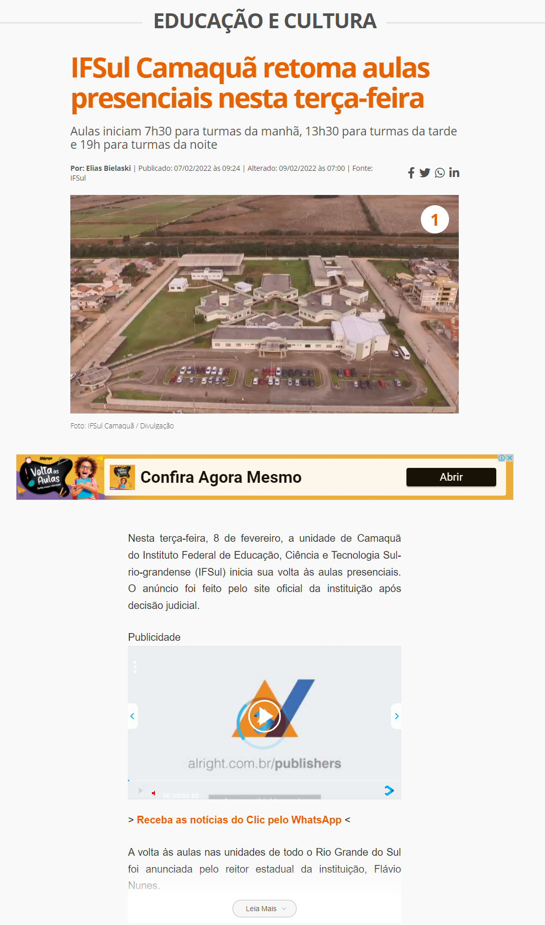 Clique Camaquã - IFSul Camaquã retoma aulas presenciais nesta terça-feira