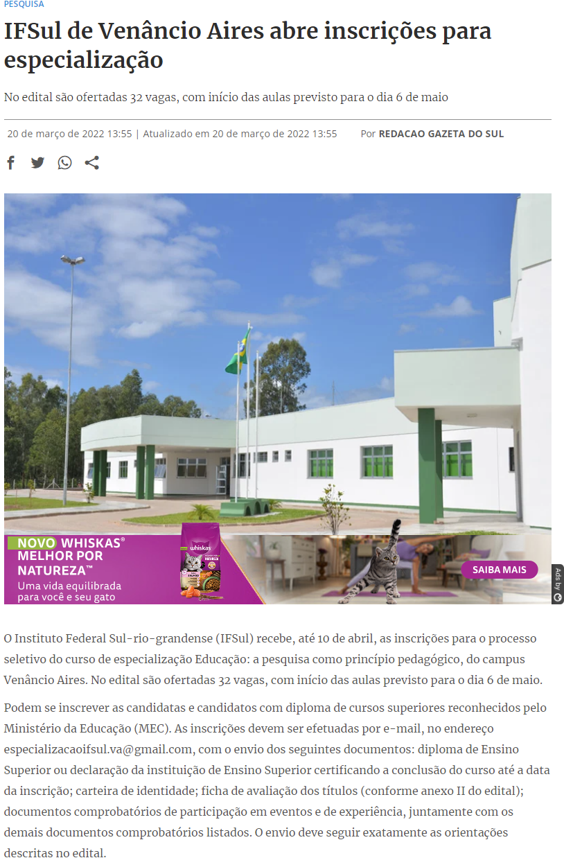 Gaz - Notícias de Santa Cruz: IFSul de Venâncio Aires abre inscrições para especialização