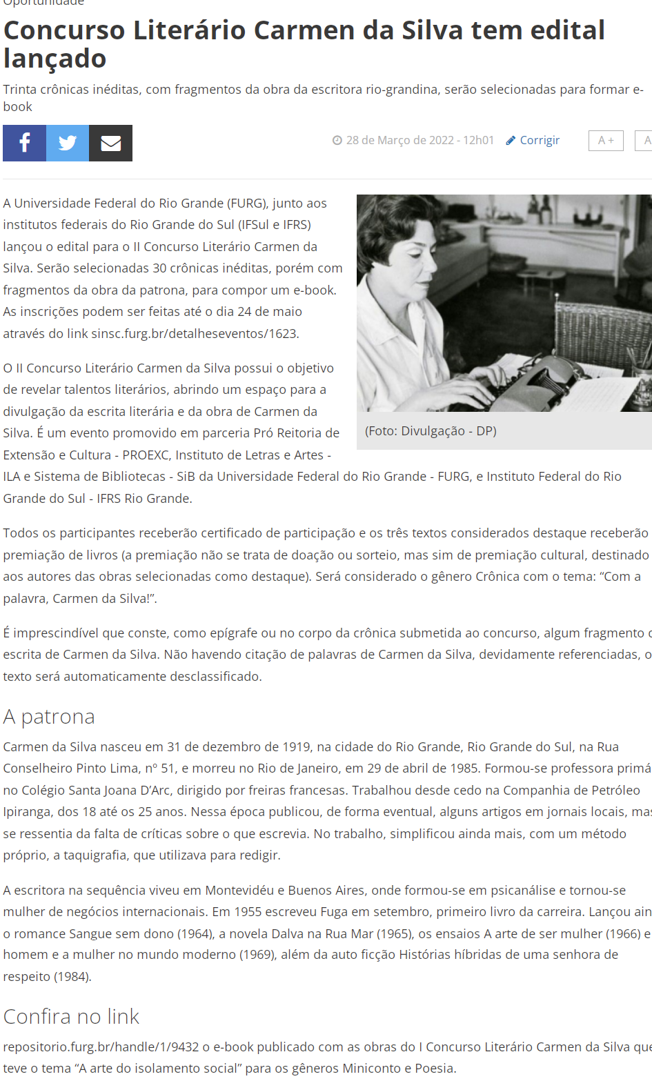 Diário Popular: Concurso Literário Carmen da Silva tem edital lançado | Cultura & entretenimento
