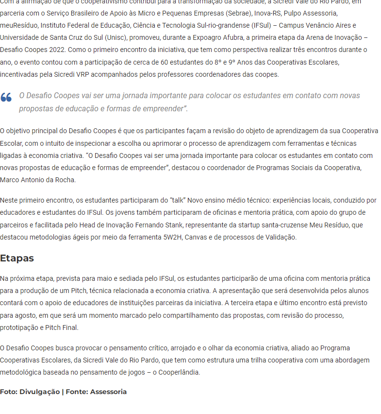Expansão: Desafio Coopes propõe aprimorar o processo de aprendizagem das cooperativas escolares