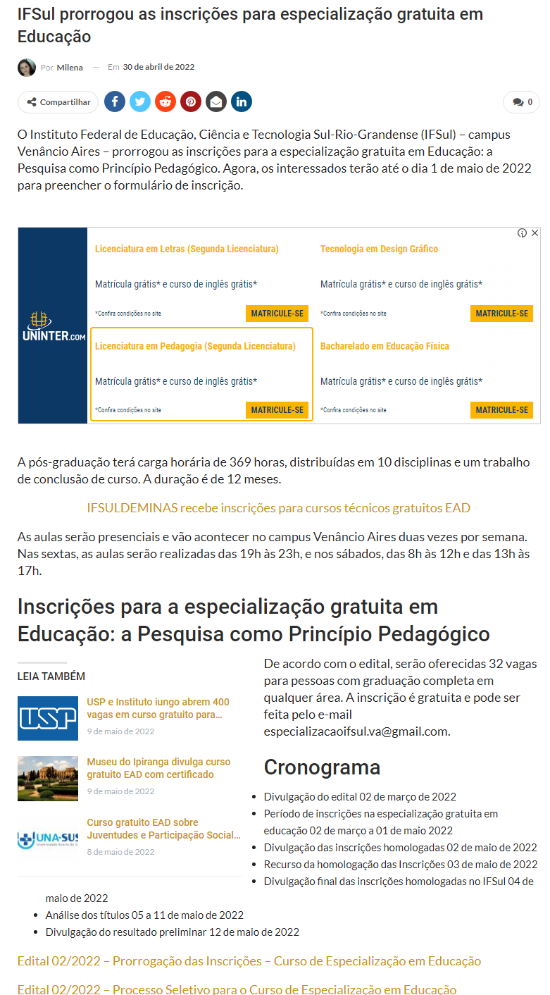 Hora Brasil - IFSul prorrogou as inscrições para especialização gratuita em Educação | Hora Brasil