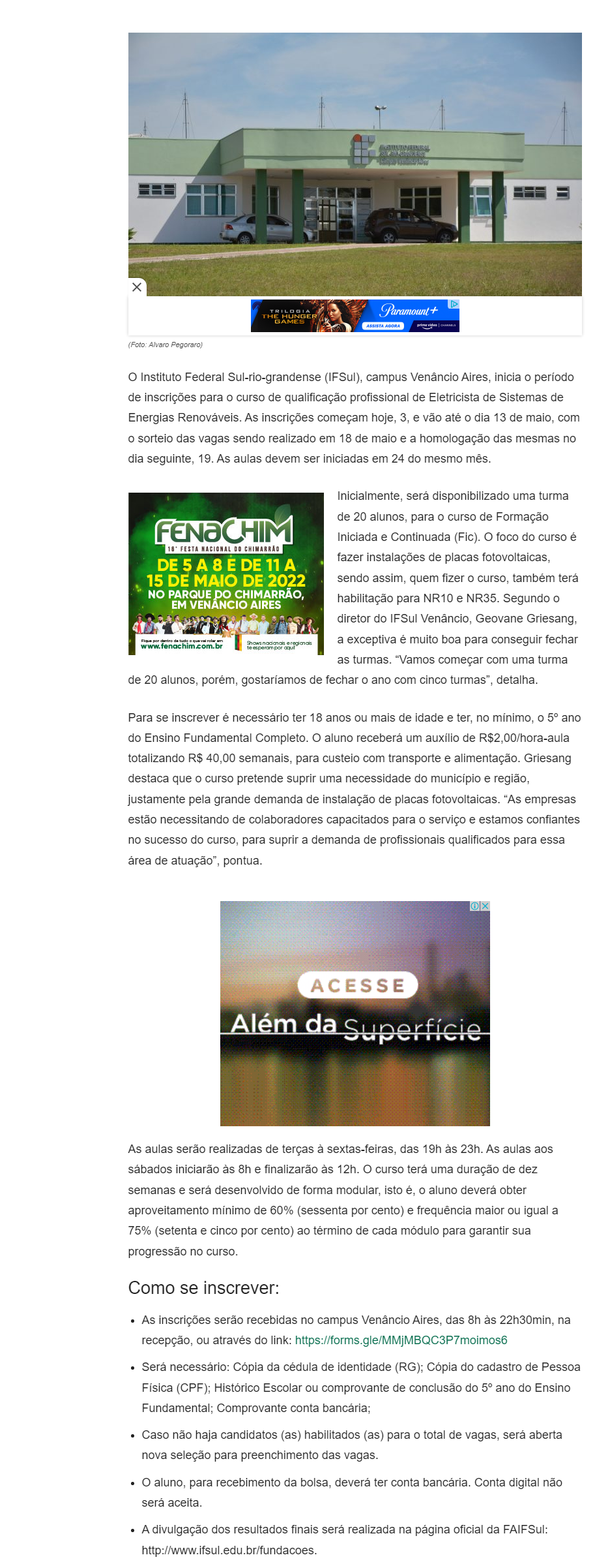 Folha do Mate - IFSul abre inscrições para curso de Eletricista de Sistemas de Energias Renováveis