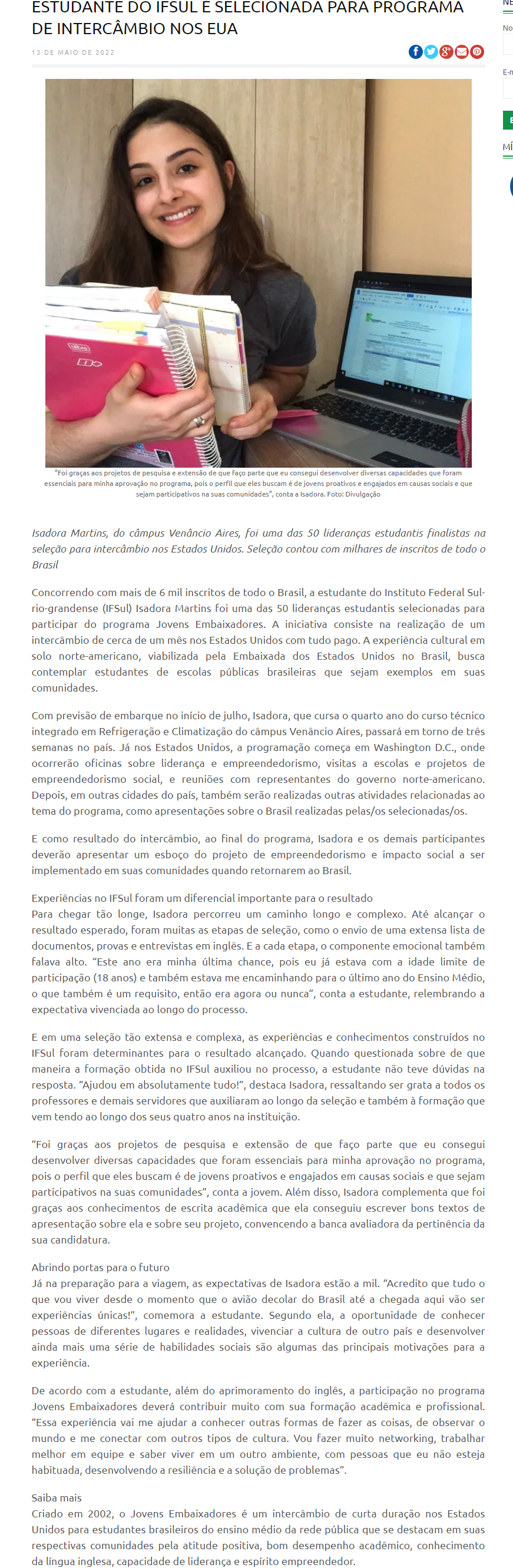 Caminhos da Zona Sul - ESTUDANTE DO IFSUL É SELECIONADA PARA PROGRAMA DE INTERCÂMBIO NOS EUA
