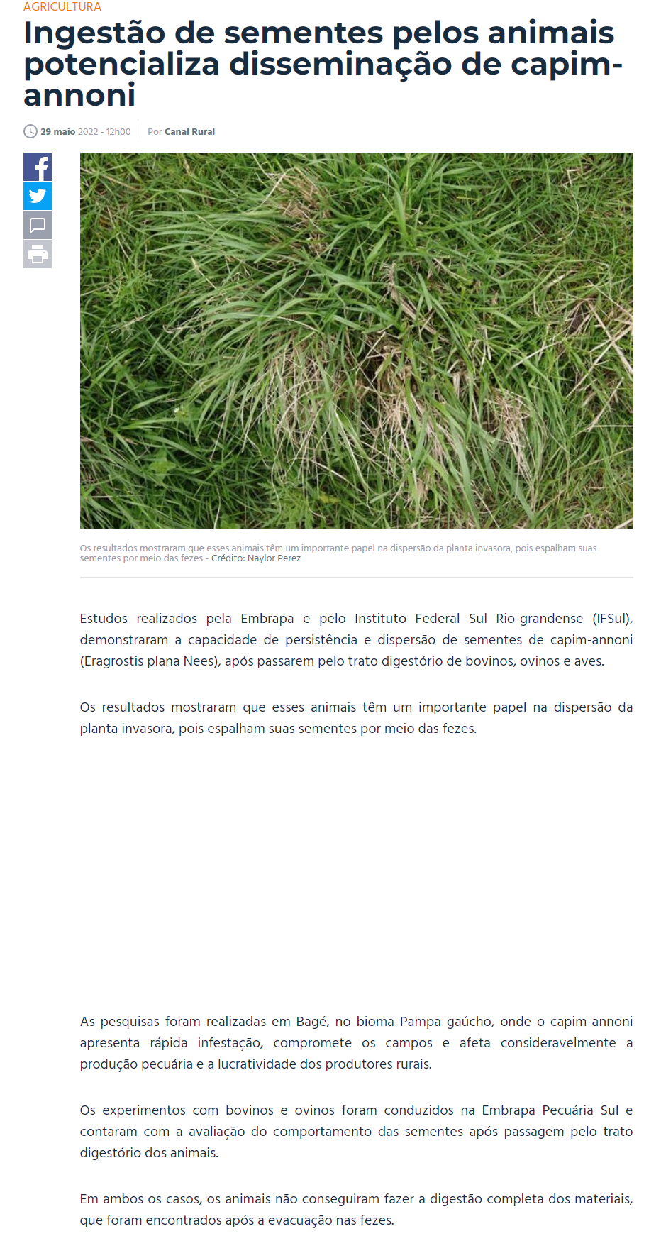 Dourados News - Ingestão de sementes pelos animais potencializa disseminação de capim-annoni