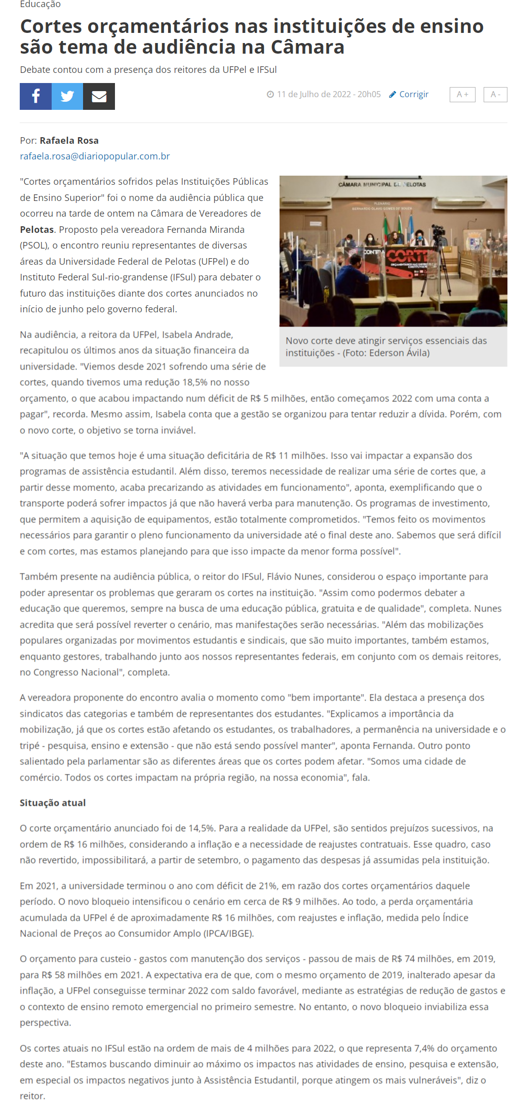 Diário popular - Cortes orçamentários nas instituições de ensino são temas de debate na Cãmara