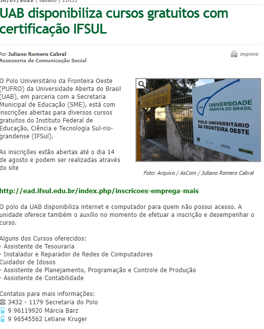 Prefeitura Municipal de Itaqui - UAB disponibiliza cursos gratuitos com certificação IFSUL