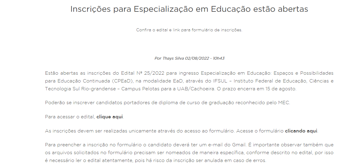 TV Cachoeira- Inscrições para Especialização em Educação estão abertas