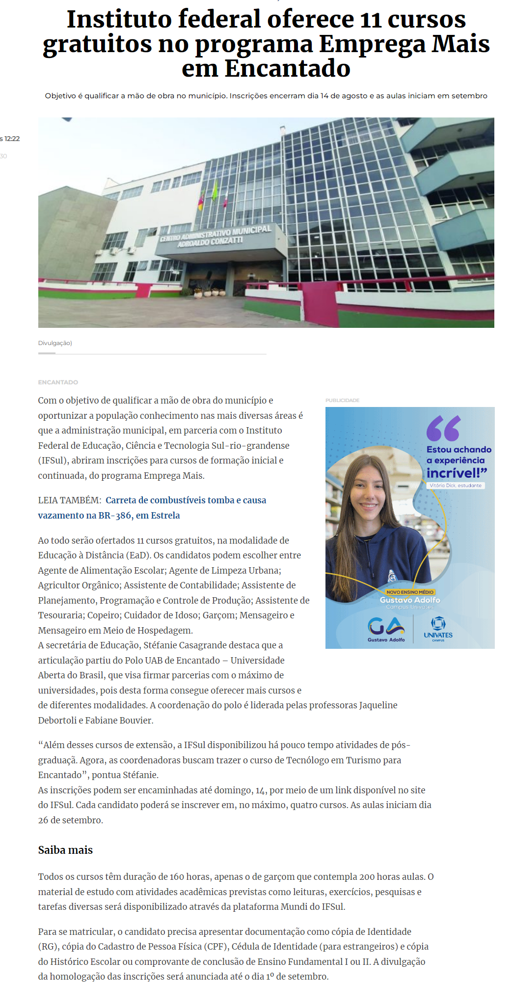Jornal A Hora - Instituto federal oferece 11 cursos gratuitos no programa Emprega Mais em Encantado