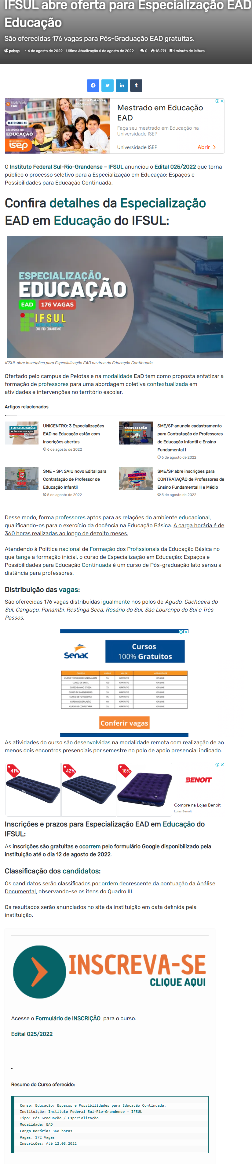 PEBSP - IFSUL abre oferta para Especialização EAD em Educação