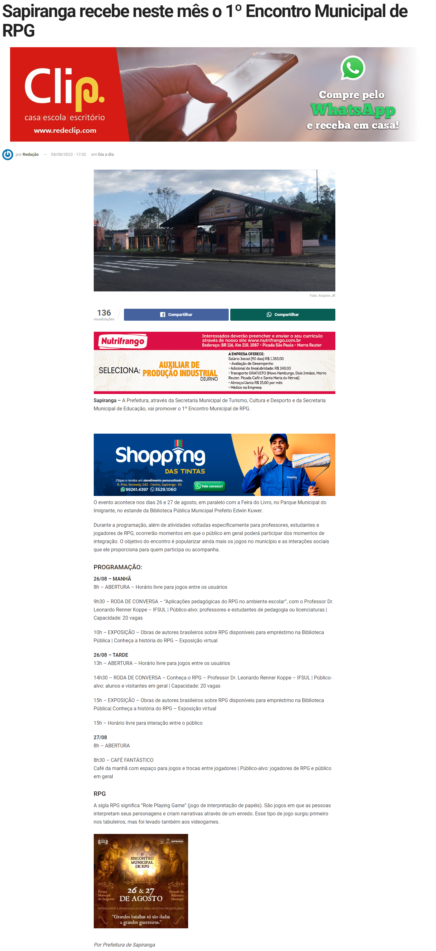 Jornal Repercussão - Sapiranga recebe neste mês o 1º Encontro Municipal de RPG