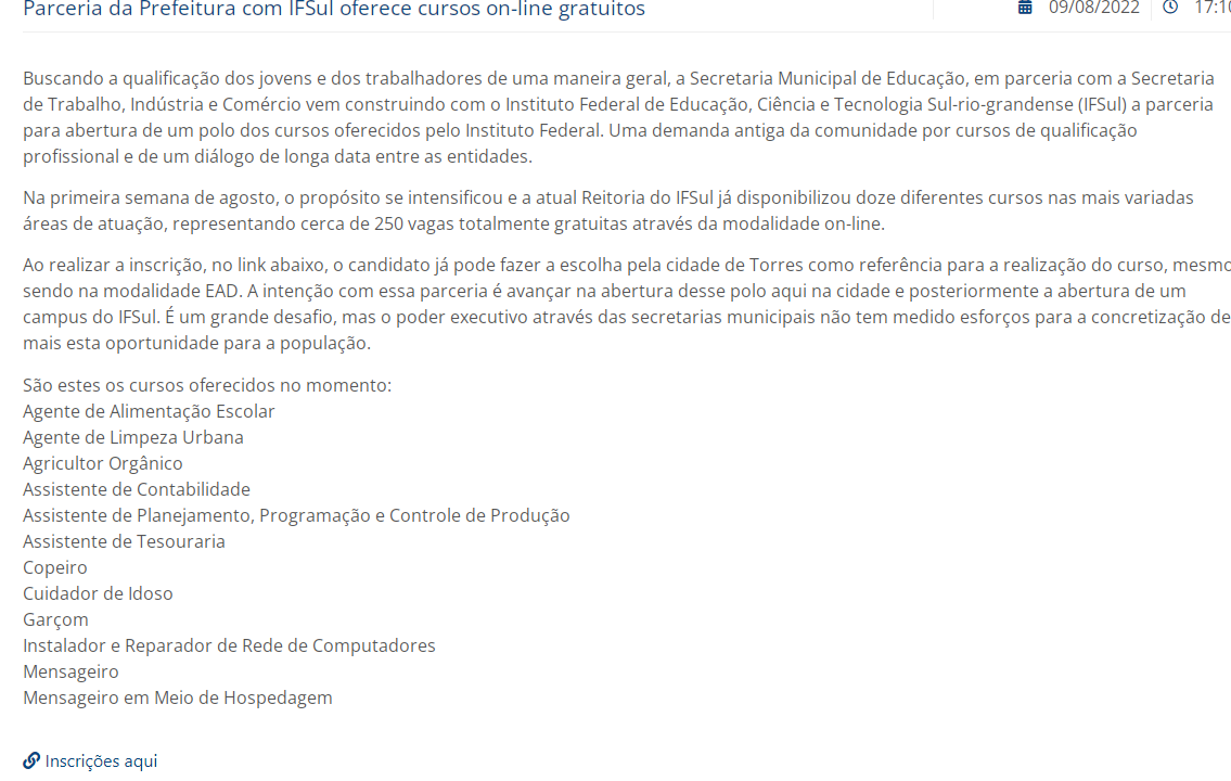 Prefeiutura de Torres - Parceria da Prefeitura com IFSul oferece cursos on-line gratuitos