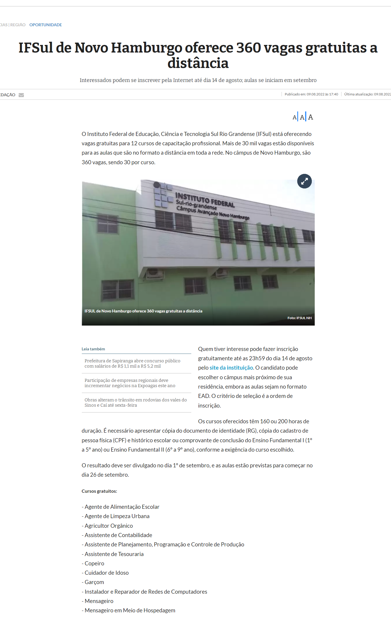 NH - IFSul de Novo Hamburgo oferece 360 vagas gratuitas a distância