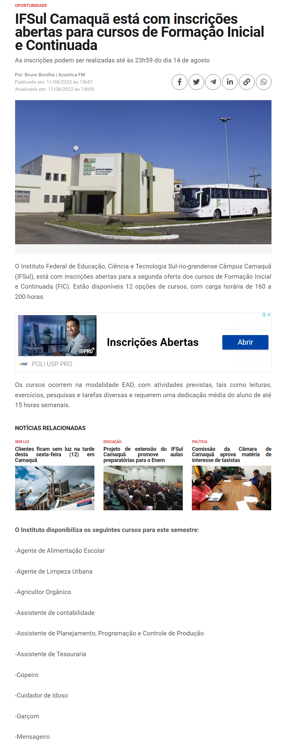 Rádio Acústica FM - IFSul Camaquã está com inscrições abertas para cursos de Formação Inicial e Continuada