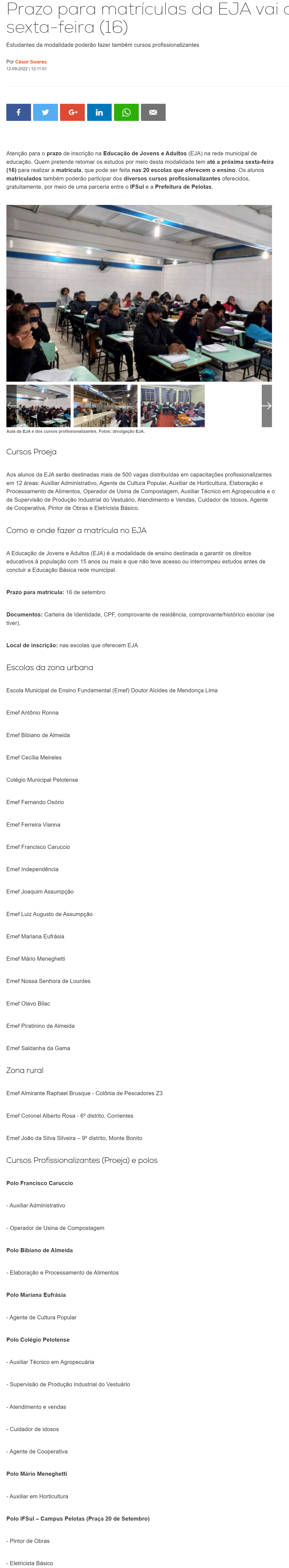 Site da Prefeitura de Pelotas - Prazo para matrículas da EJA vai até sexta-feira (16)