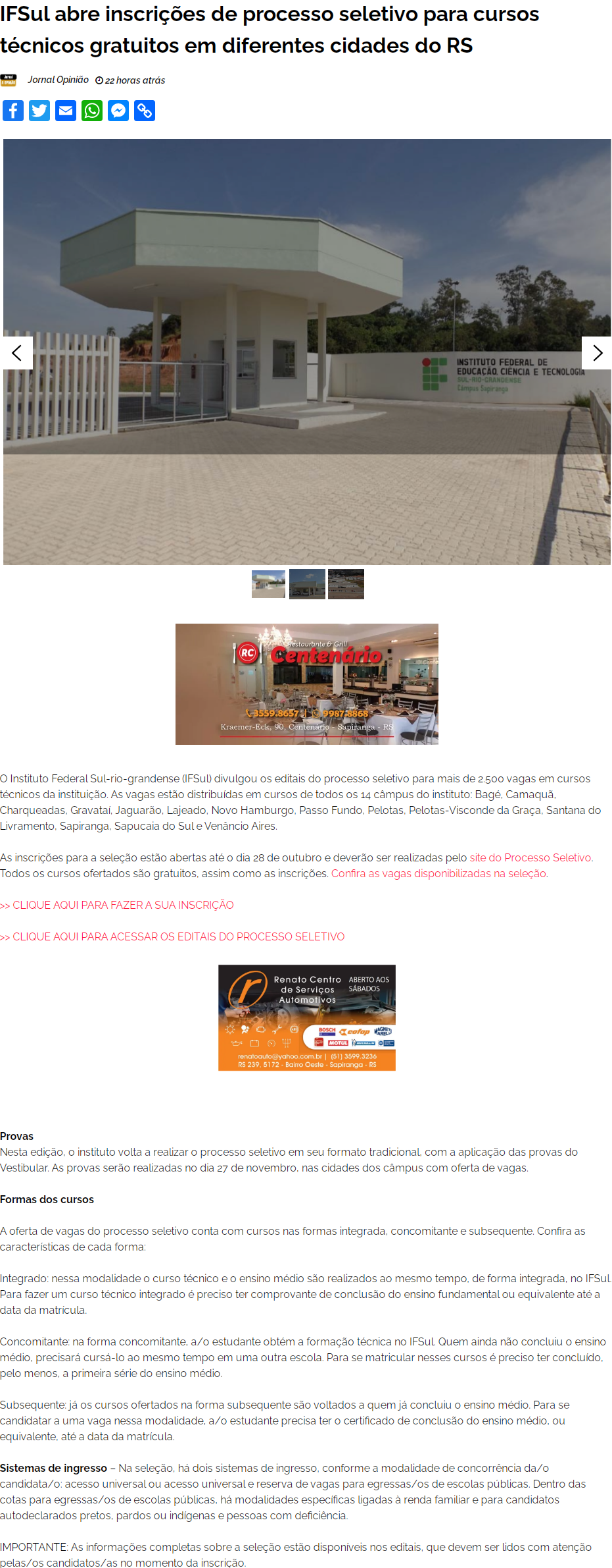 Jornal A Opinião - IFSul abre inscrições de processo seletivo para cursos técnicos gratuitos em diferentes cidades do RS