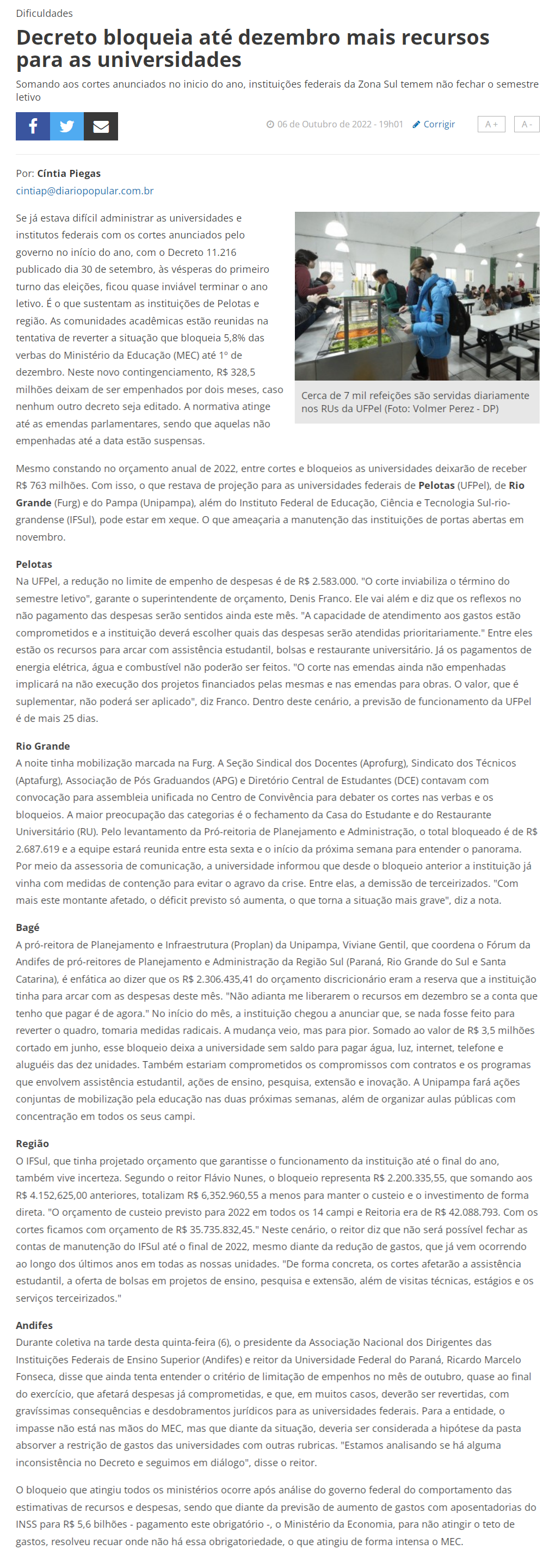 Diário Popular - Decreto bloqueia até dezembro mais recursos para as universidades