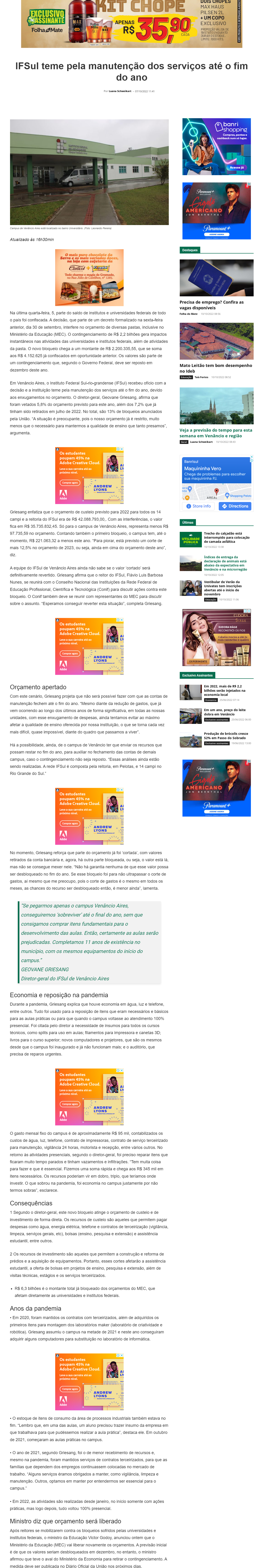 Folha do Mate - IFSul teme pela manutenção dos serviços até o fim do ano