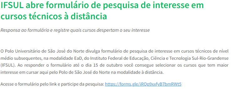 Prefeitura de São José do Norte - IFSUL abre formulário de pesquisa de interesse em cursos técnicos à distância