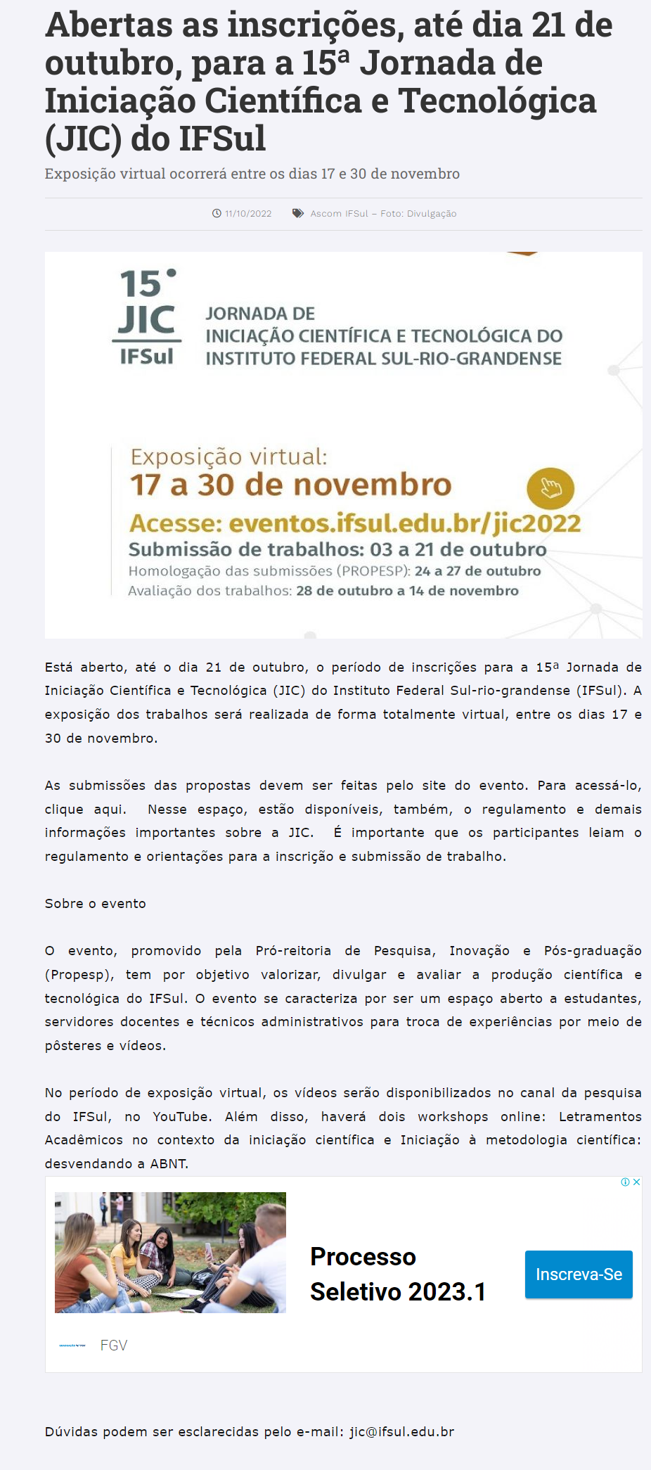 Portal Camaquã - Abertas as inscrições, até dia 21 de outubro, para a 15ª Jornada de Iniciação Científica e Tecnológica do IFSul (JIC)