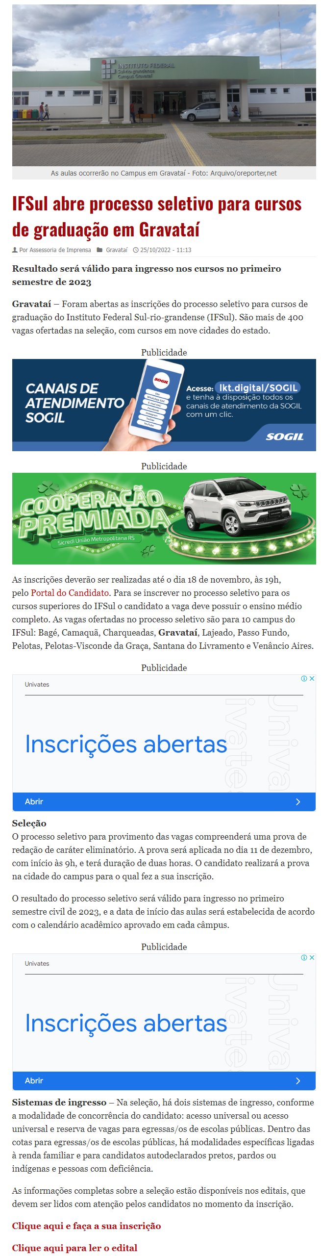 O Reporter.Net - IFSul abre processo seletivo para cursos de graduação em Gravataí