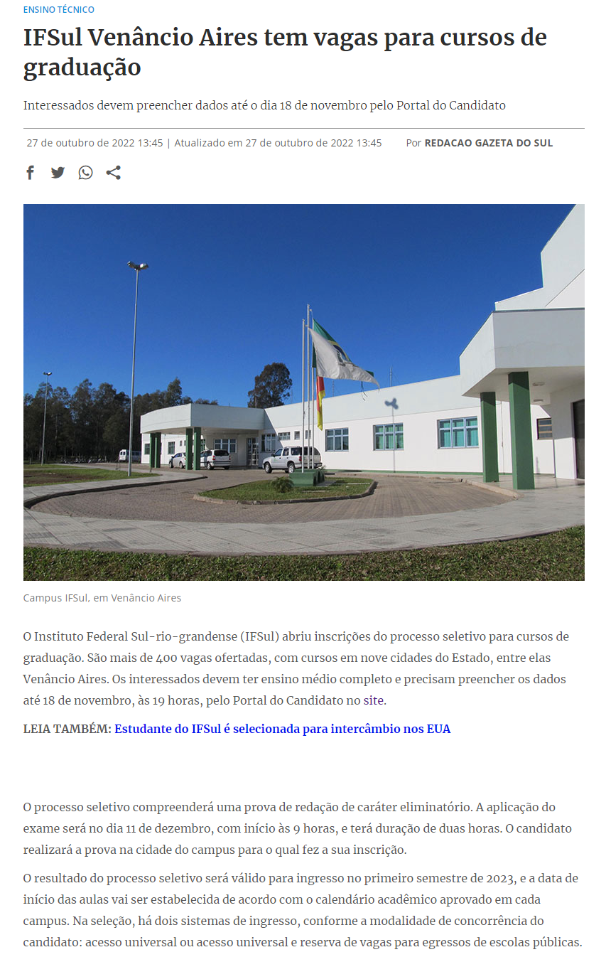 GAZ - IFSul Venâncio Aires tem vagas para cursos de graduação