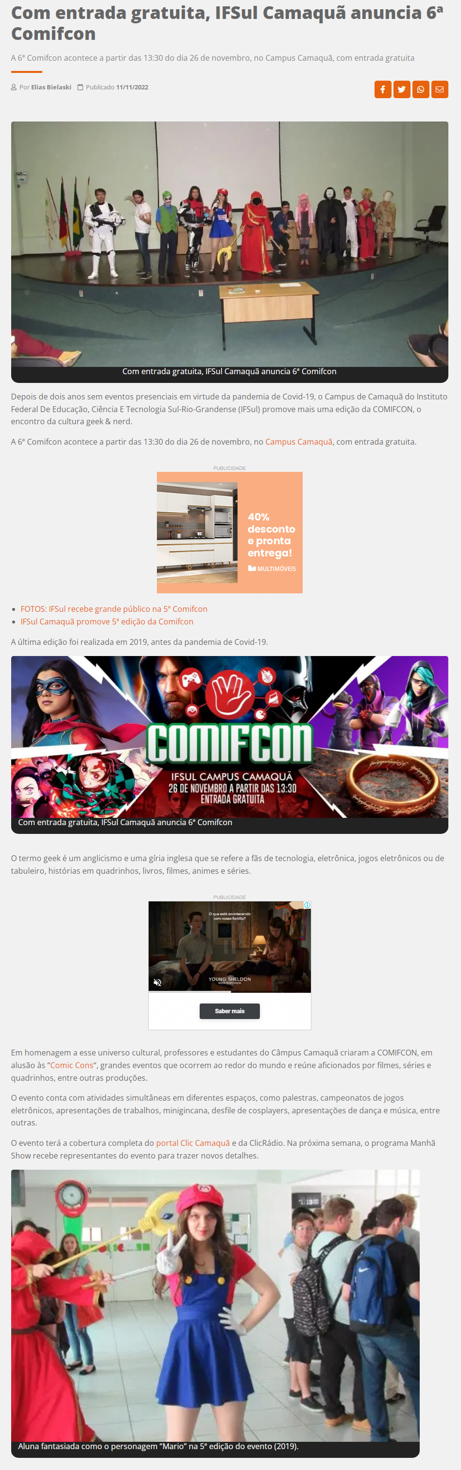Clic Camaquã - Com entrada gratuita, IFSul Camaquã anuncia 6ª Comifcon