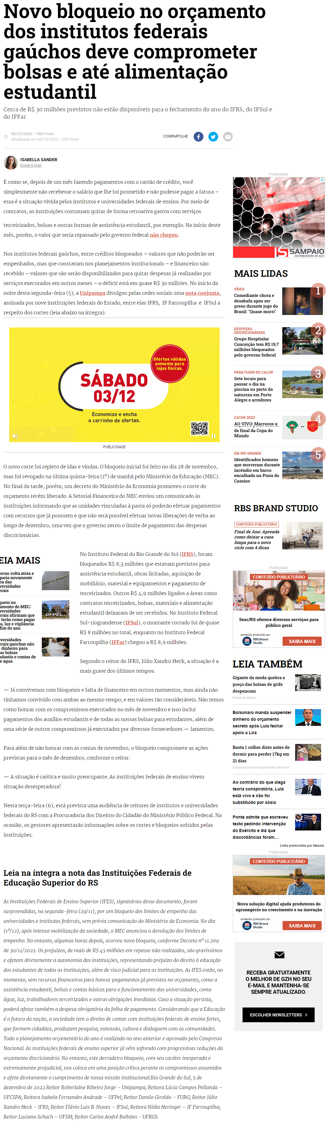 GZH - Novo bloqueio no orçamento dos institutos federais gaúchos deve comprometer bolsas e até alimentação estudantil