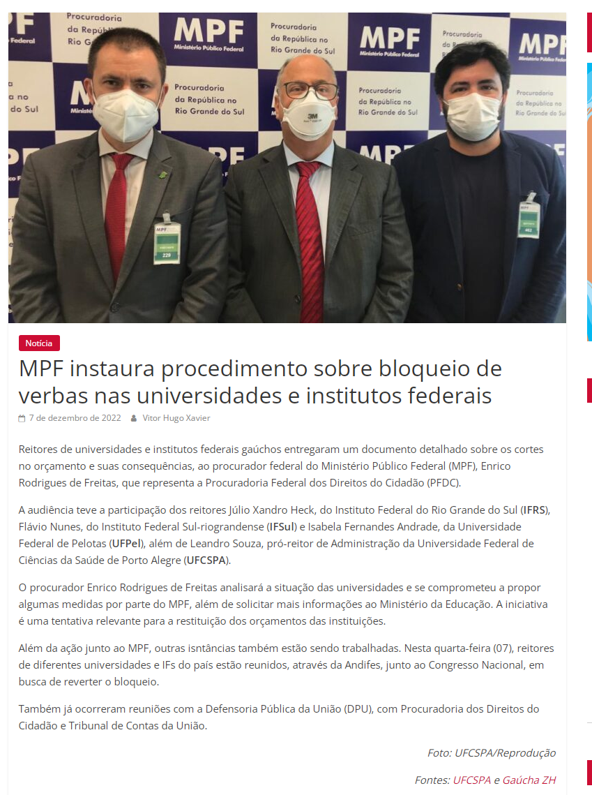 Assufrgs - MPF instaura procedimento sobre bloqueio de verbas nas universidades e institutos federais