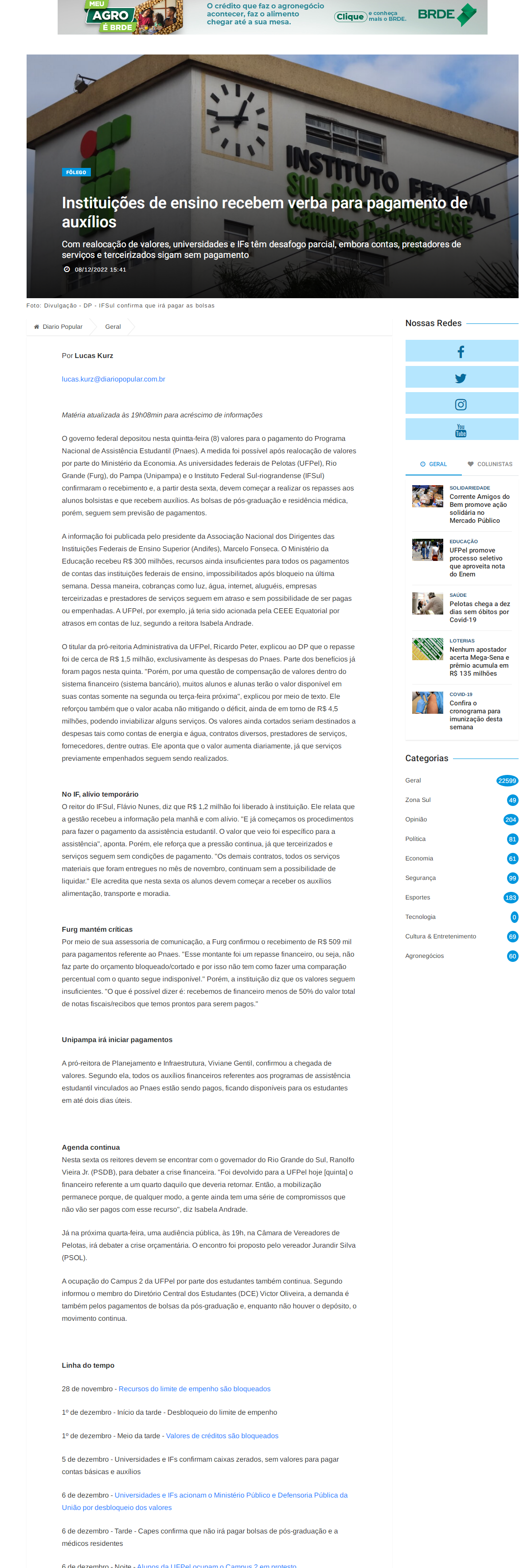 Diário Popular - Instituições de ensino recebem verba para pagamento de auxílios