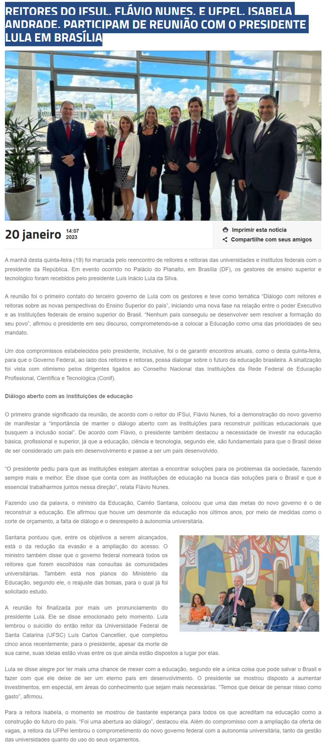 Diário da Manhã - REITORES DO IFSUL, FLÁVIO NUNES, E UFPEL, ISABELA ANDRADE, PARTICIPAM DE REUNIÃO COM O PRESIDENTE LULA EM BRASÍLIA