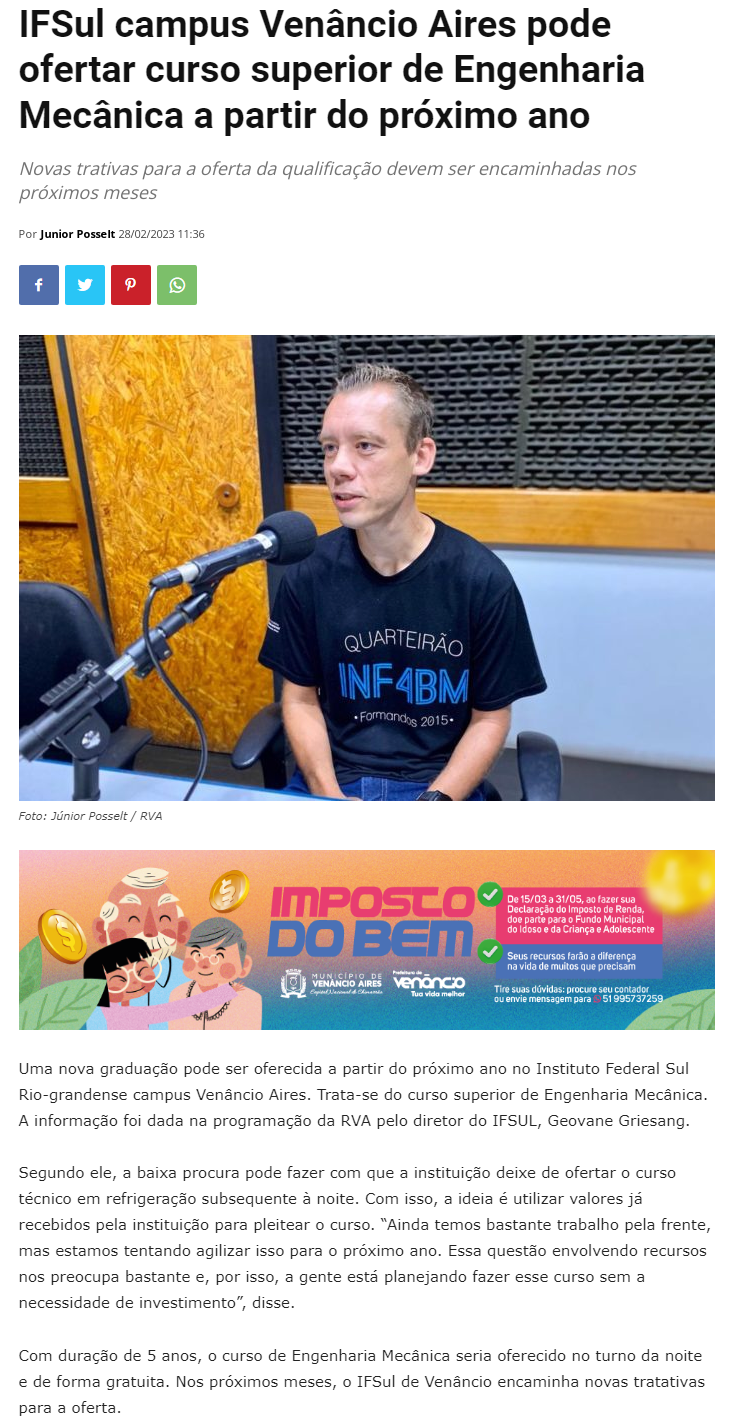Portal RVA - IFSul campus Venâncio Aires pode ofertar curso superior de Engenharia Mecânica a partir do próximo ano