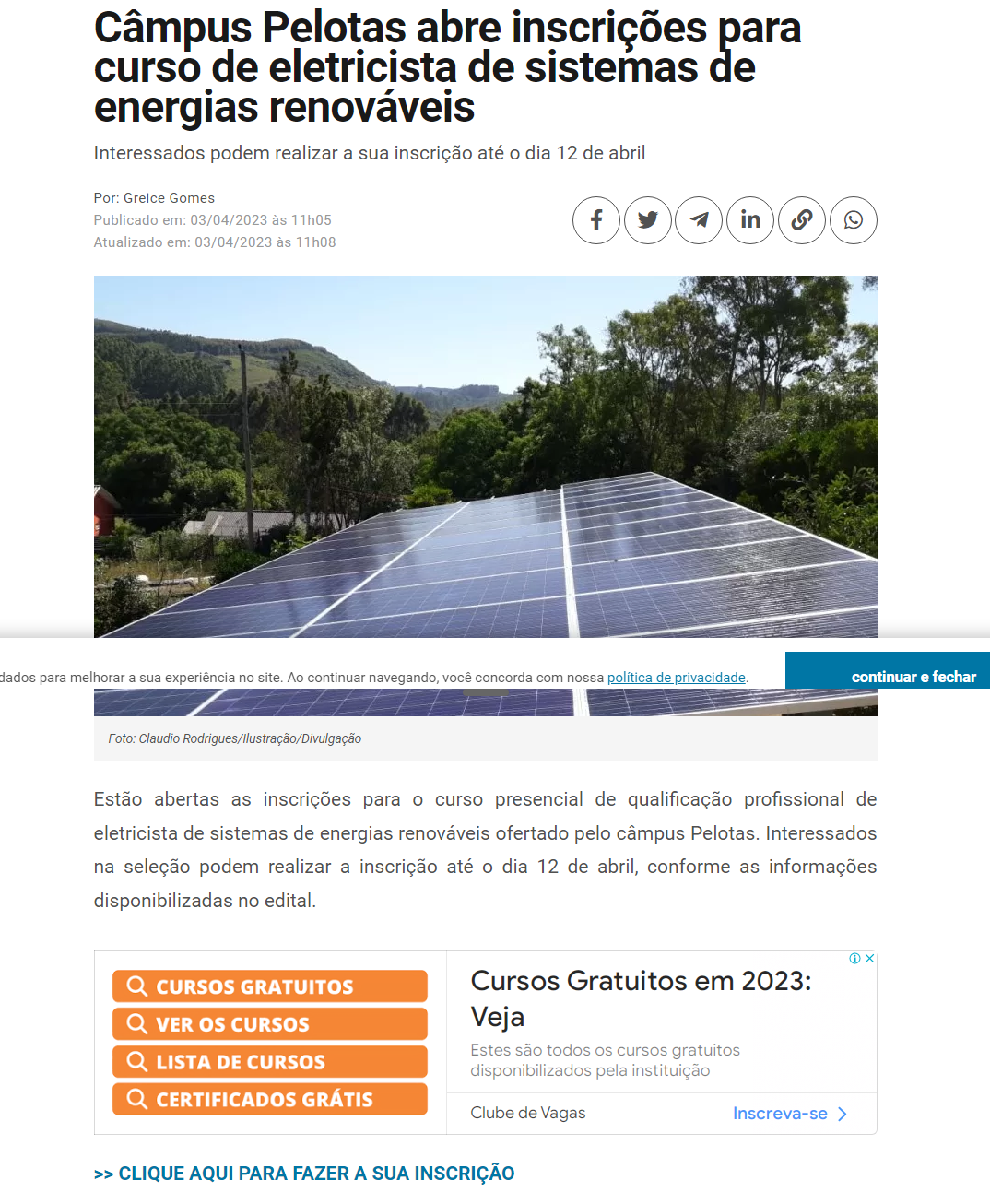 Acústica FM - Câmpus Pelotas abre inscrições para curso de eletricista de sistemas de energias renováveis