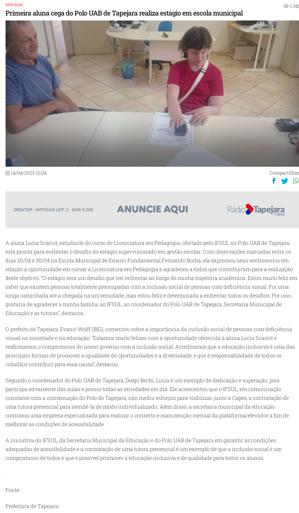 Rádio Tapejara - Primeira aluna cega do Polo UAB de Tapejara realiza estágio em escola municipal
