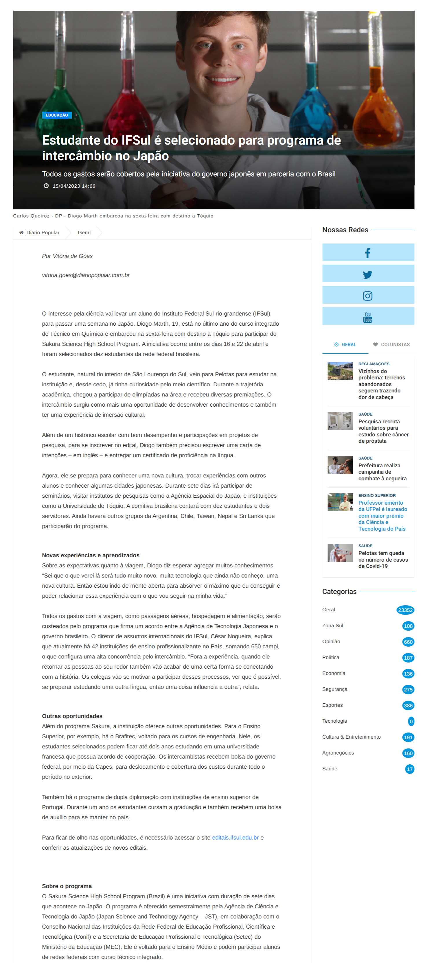 Diário popular - Estudante do IFSul é selecionado para programa de intercâmbio no Japão (online)