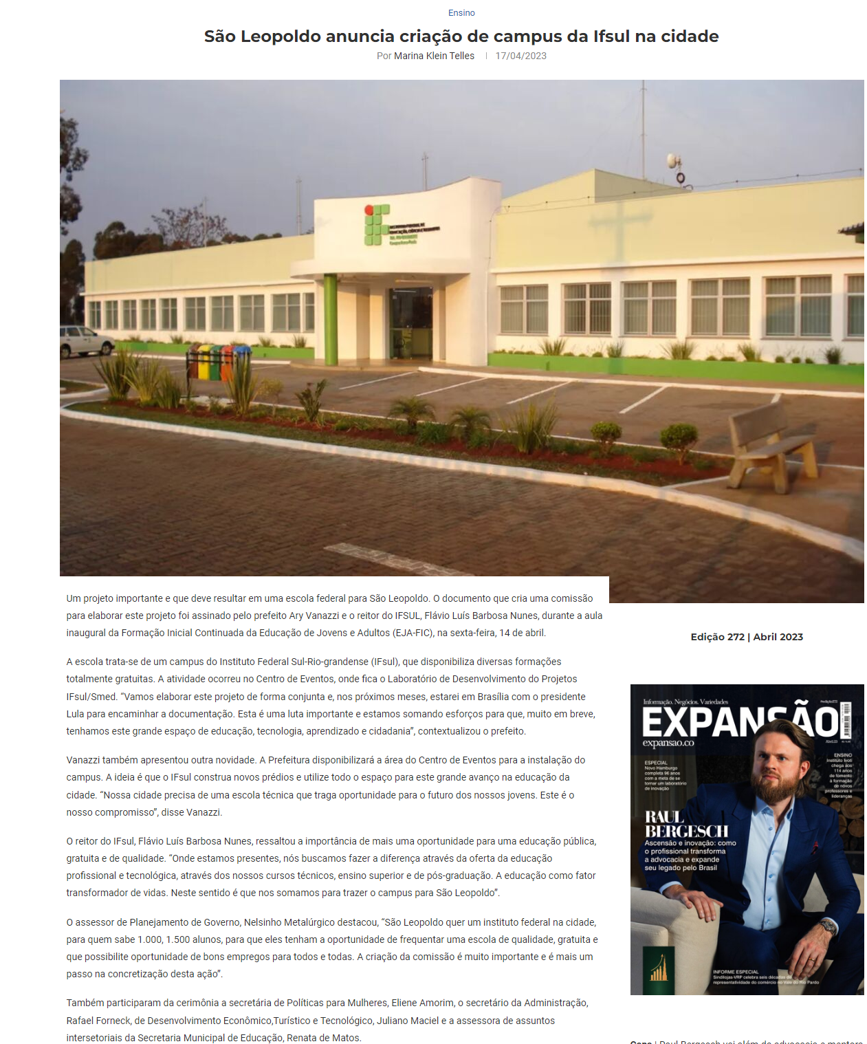 Expansão - São Leopoldo anuncia criação de campus da Ifsul na cidade